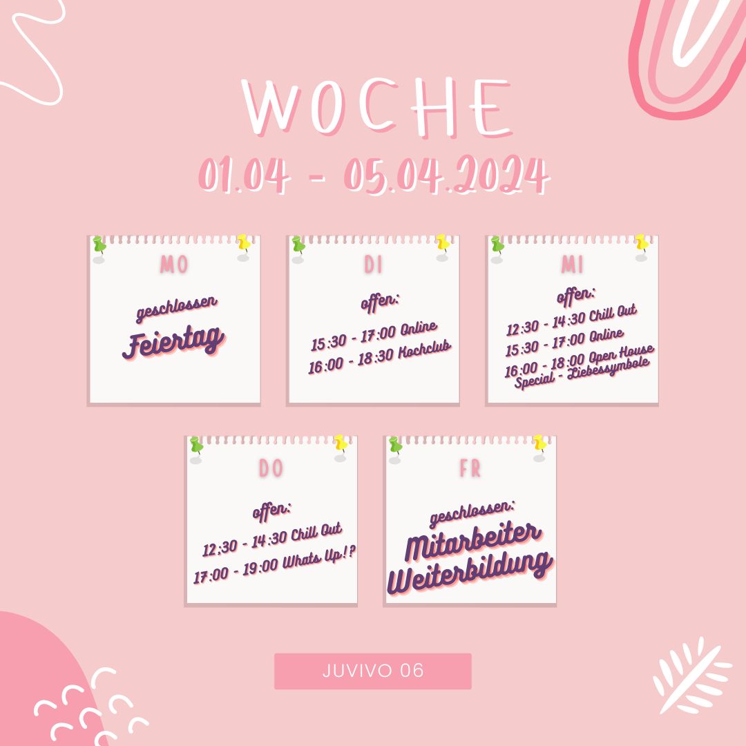In der Woche vom 1. bis 5. April haben wir durch Feiertage und Mitarbeiter*innen-Weiterbildung ein bisschen ein anderes Programm. Montag und Freitag sind wir geschlossen. Dienstag, Mittwoch und Donnerstag freuen wir uns auf Dich!