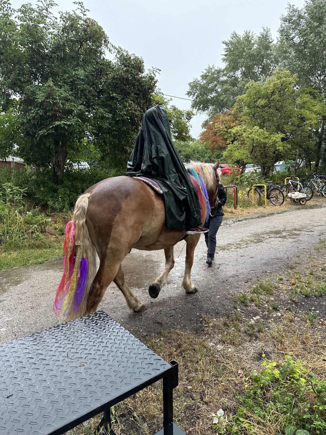 Ein nasses Abenteuer: Bei leichtem Regen begaben sich eine Gruppe fröhlicher Kinder und Jugendlicher auf eine aufregende Pferdewanderung. Die Pferde empfingen uns mit neugierigen Blicken, und wir widmeten uns ihrer Pflege. Der Regen glänzte auf ihren Fellmänteln, als wir sie striegelten. [...]