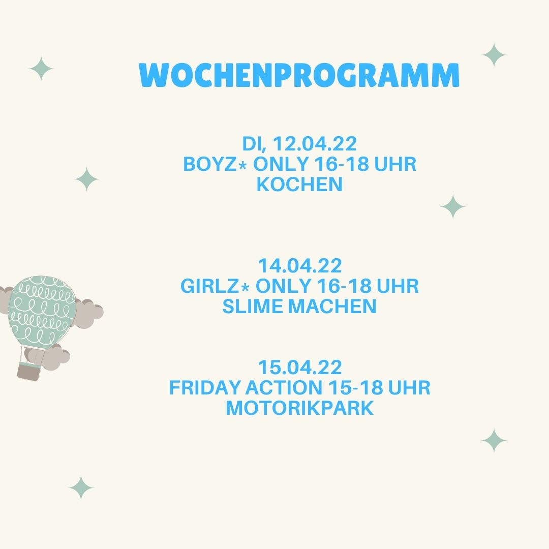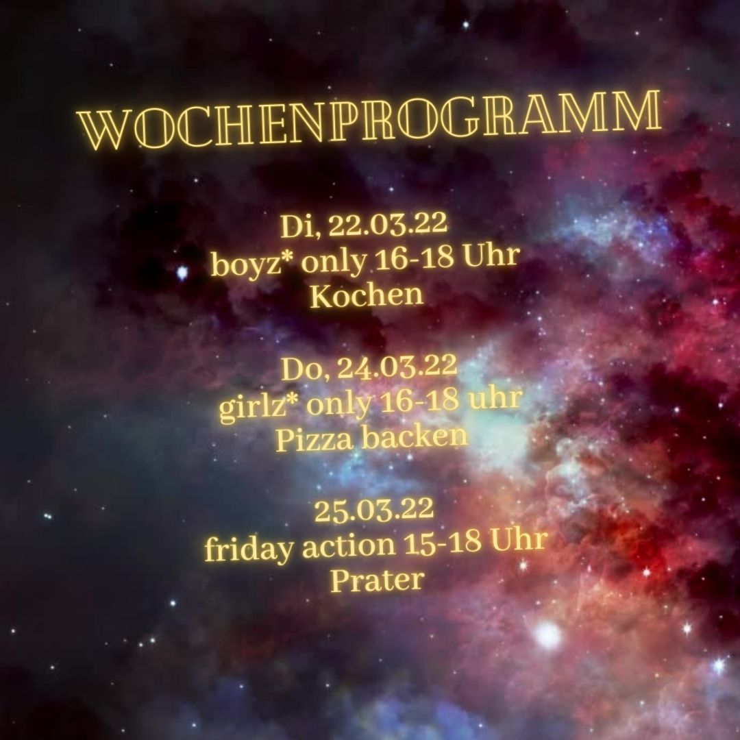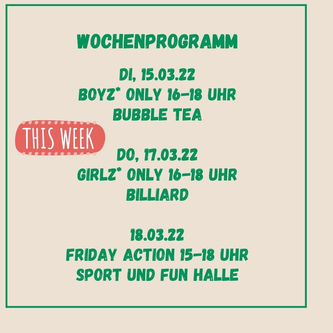 Unser Wochenprogramm für diese Woche! Girlz* only findet ausnahmsweise von 15:30 - 18:00 Uhr statt, weil wir ins Kino gehen!