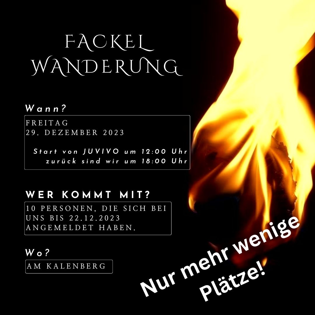 Wir gehen in den Ferien mit den Fackeln raus. Willst du mit dabei sein? Start 12:00 Uhr, wir werden am Weg etwas warmes trinken und sobald es dunkel wird zünden wir die Fackeln an und genießen die Stimmung am Weg zurück. Bist du dabei? Anmeldung bis spätestens 22.12.2023 bei [...]
