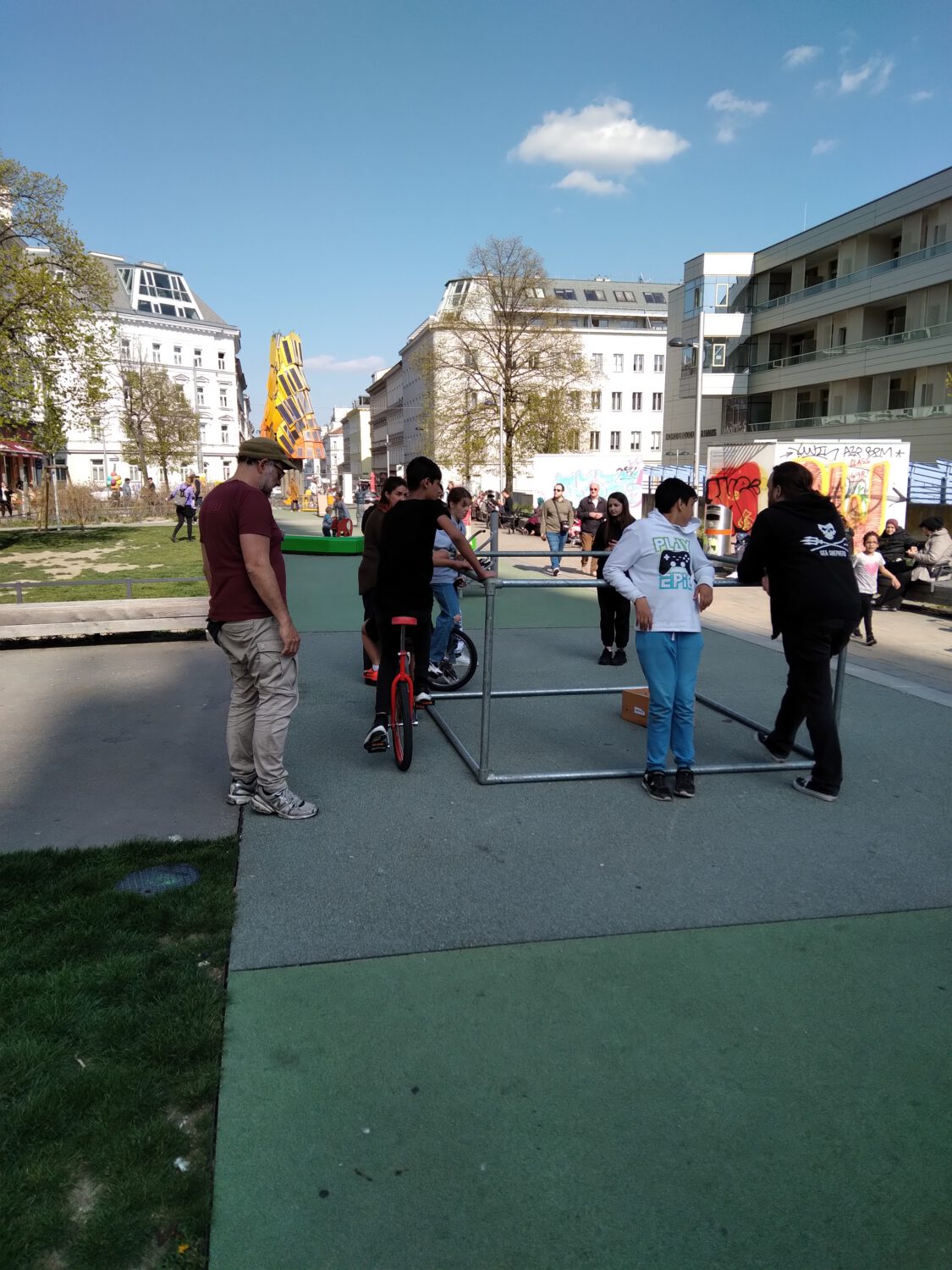 „Alles in Bewegung“ – Parkbetreuung auf der Wasserwelt/Kardinal Rauscher Platz im April 2022 Zeige grösseres Bild Spiele mit dem Schwungtuch! Kooperatives Gruppenspiel mit dem „Fröbl-Turm“ Lerne mit uns Einradfahren! Malaktion für unsere jüngeren Parkbesucher*innen Von JUVIVO.15|2022-04-25T15:07:23+02:0025. April 2022|Jugendarbeit.15-News| Ähnliche Beiträge Demokratiewerkstatt mit der VS Selzergasse Gallerie Demokratiewerkstatt mit der VS Selzergasse 26. Februar 2026 25 Jahre Circus Luftikus – Zirkustage vom 28.-31.07.2025 Gallerie 25 Jahre Circus Luftikus – Zirkustage vom 28.-31.07.2025 19. August 2025 ZOOM Mobil im Wieningerpark, am 22.7. und 5.8.2025 Gallerie ZOOM Mobil im Wieningerpark, am 22.7. und 5.8.2025 8. August 2025