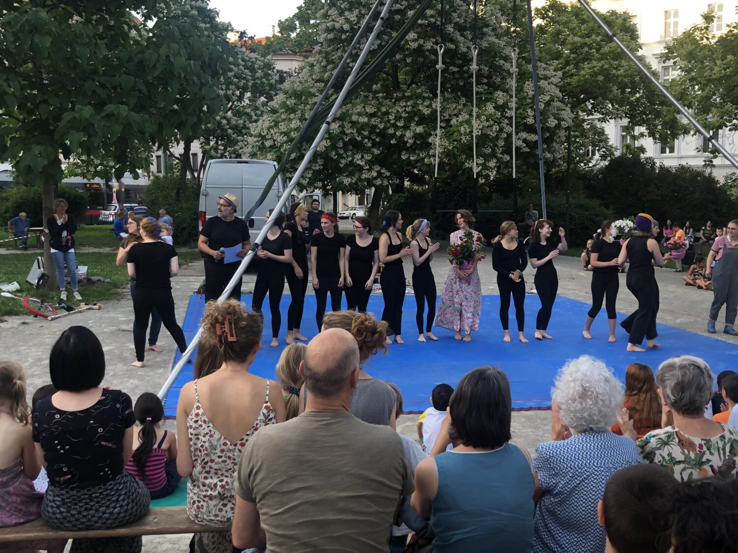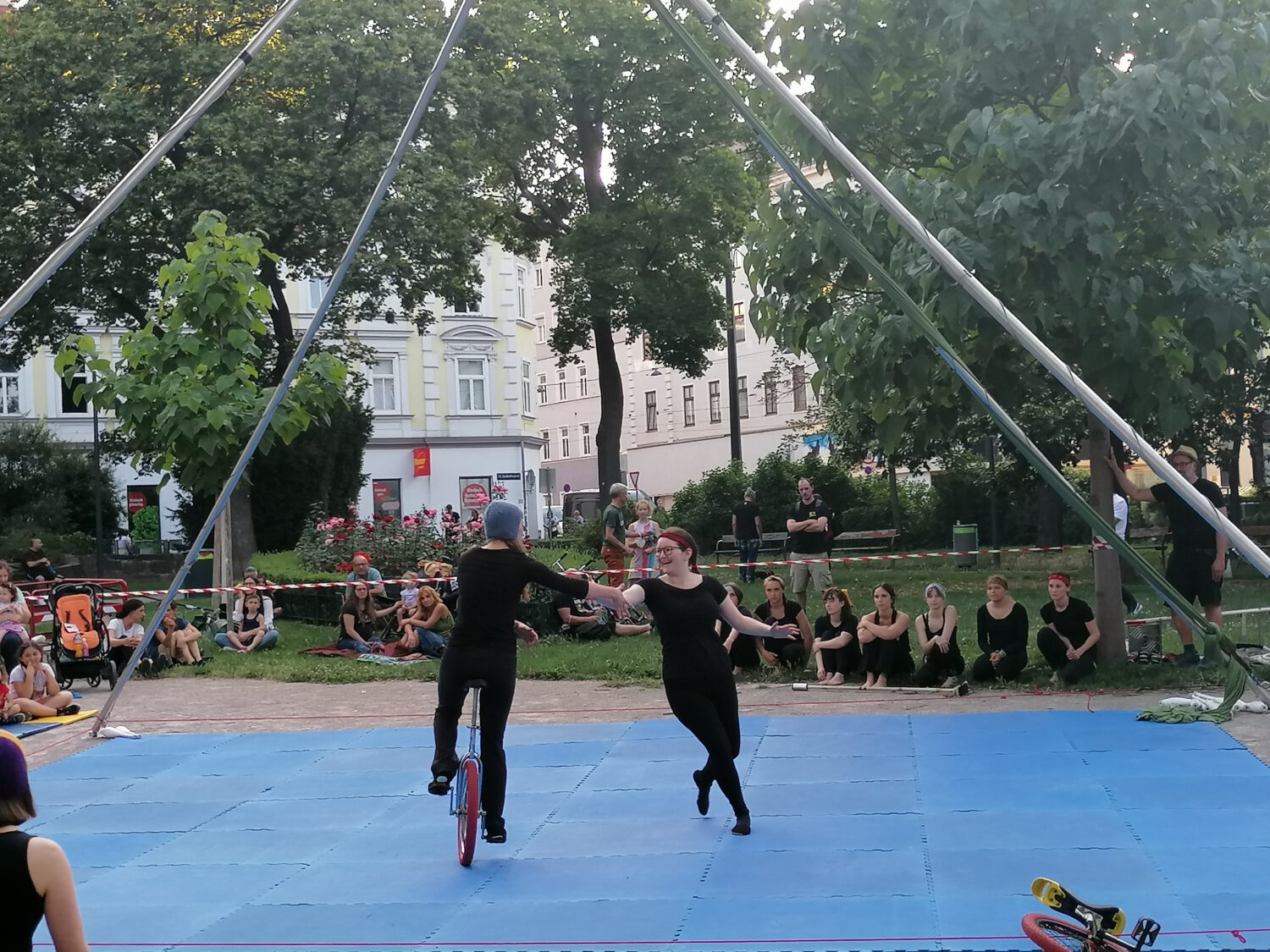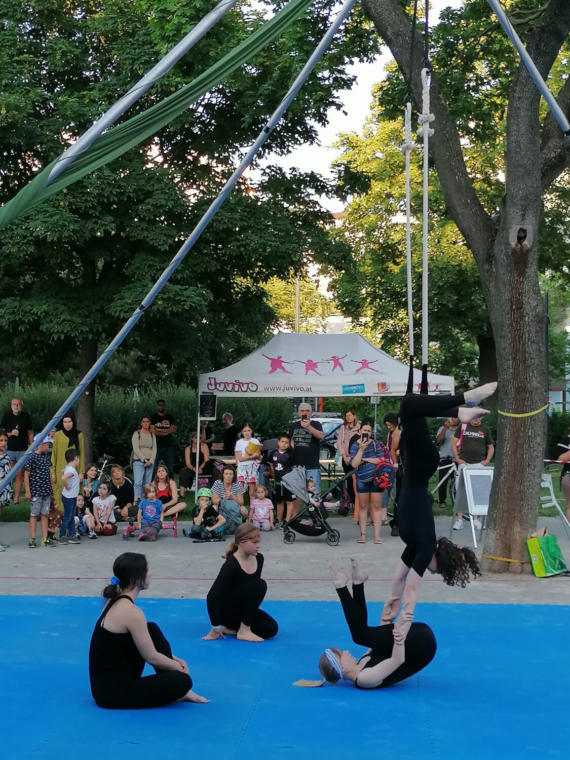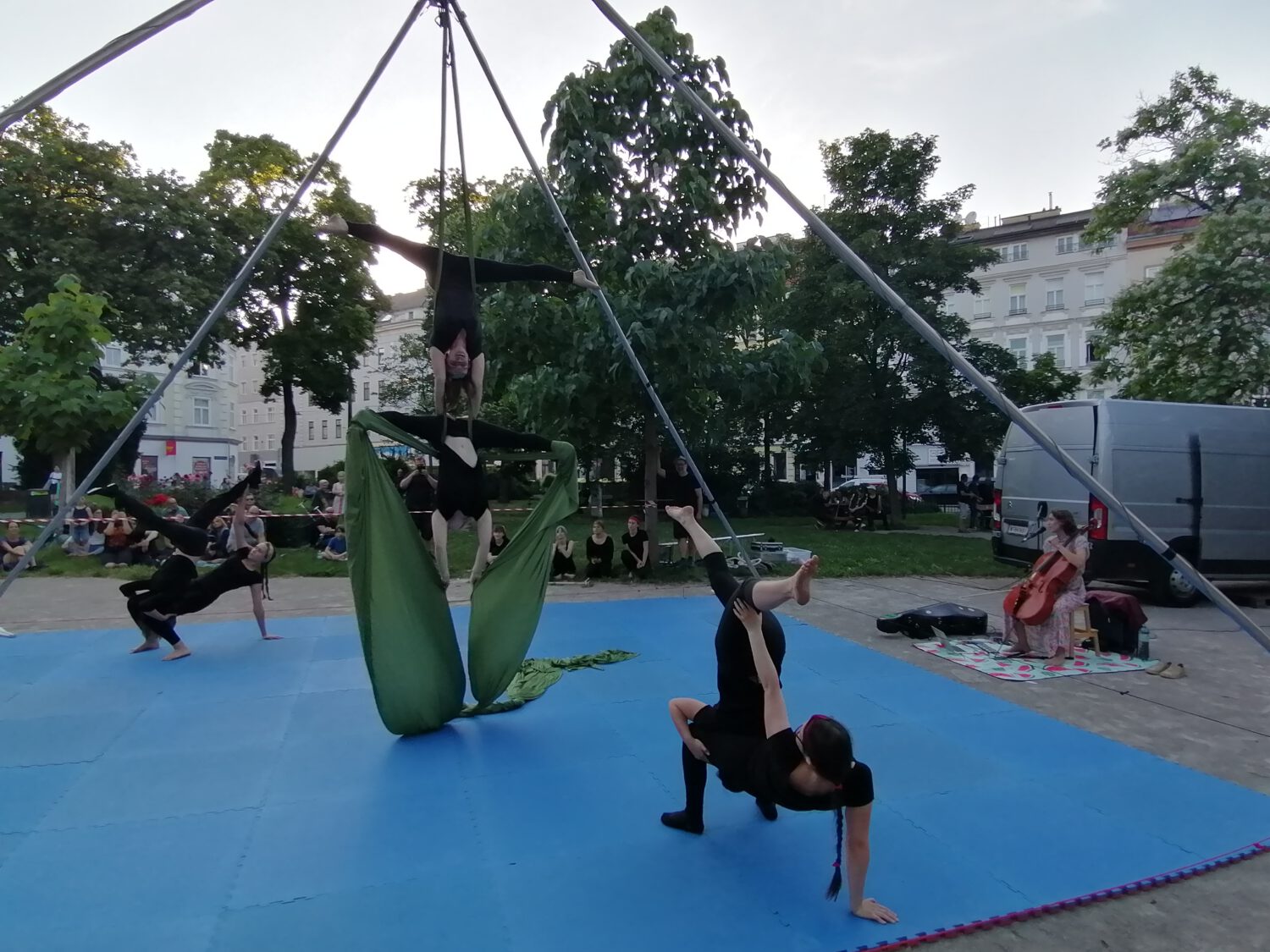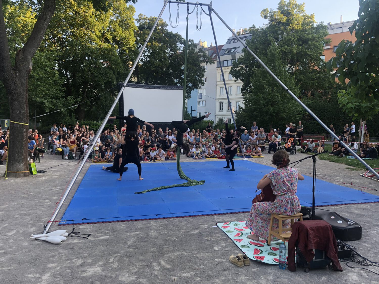 Die Circus Company des Circus Luftikus/JUVIVO.15 und der Zirkuswerkstatt performte live begleitet von der einzigartigen Cellistin Sophie Abraham als Vorprogramm zum diesjährigen VolXkino im Reithofferpark.