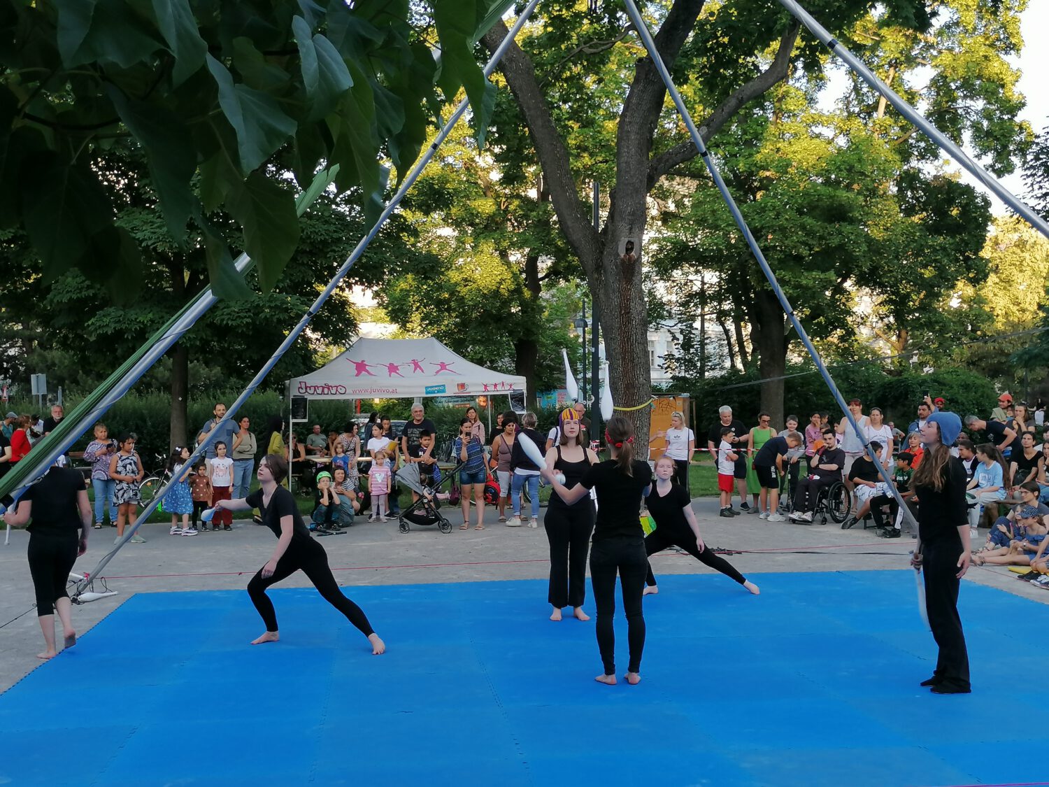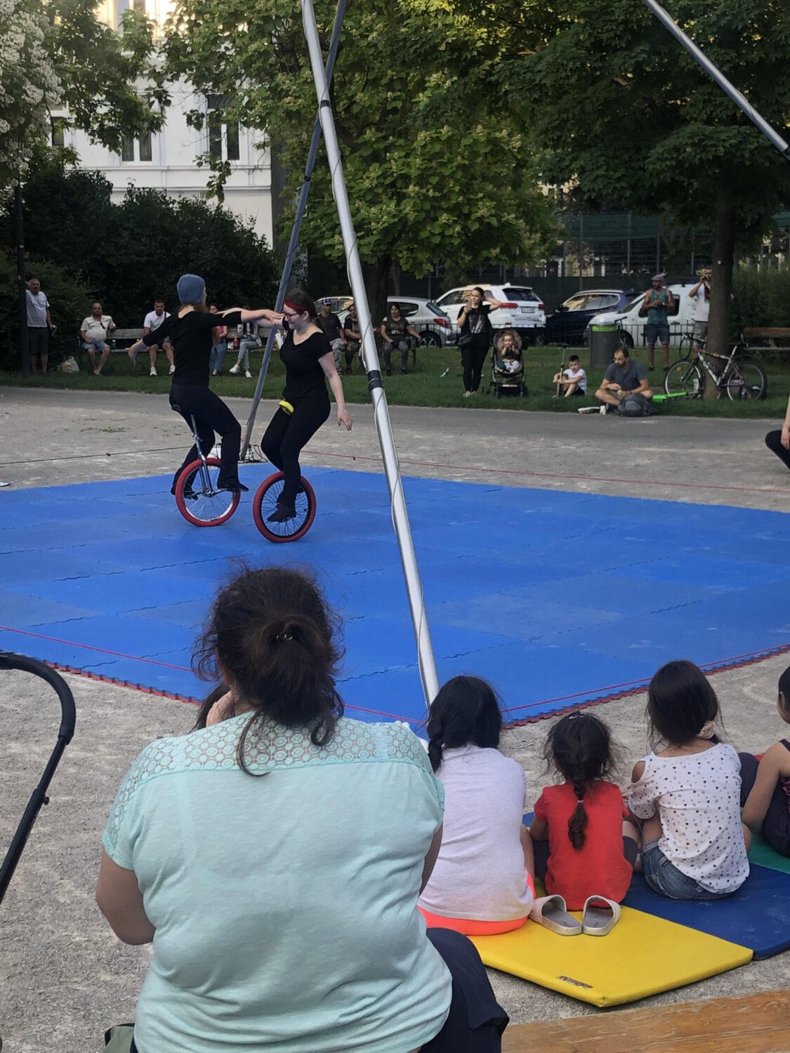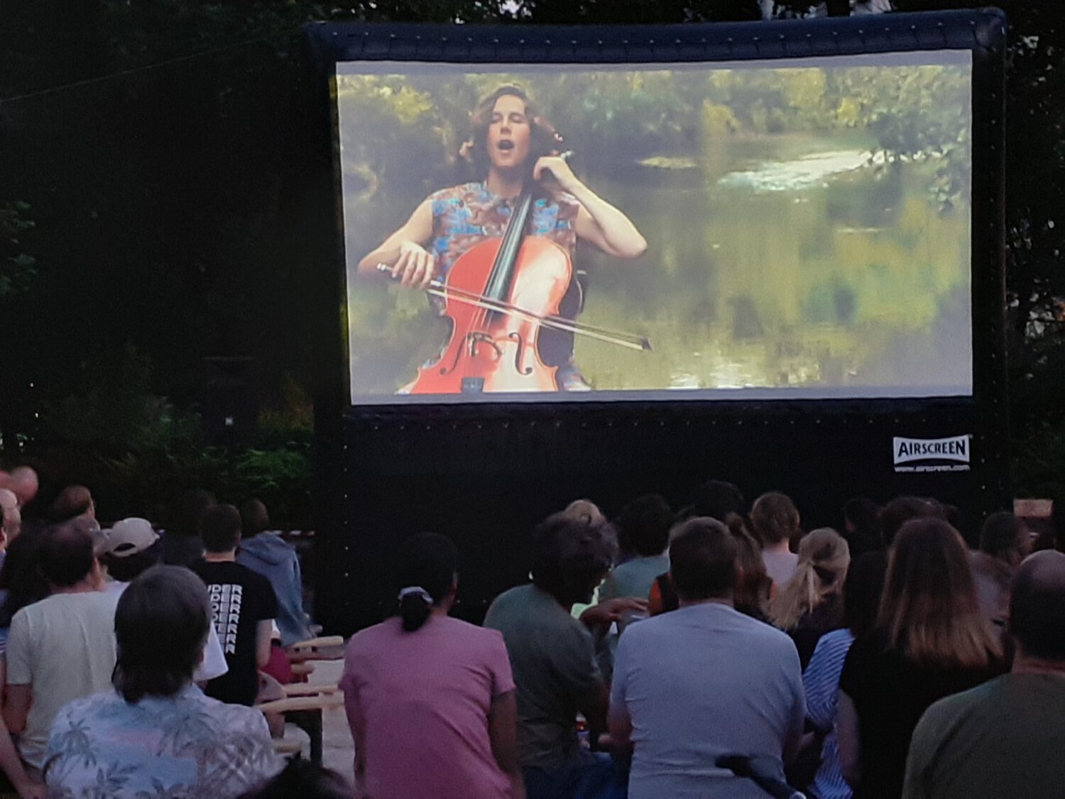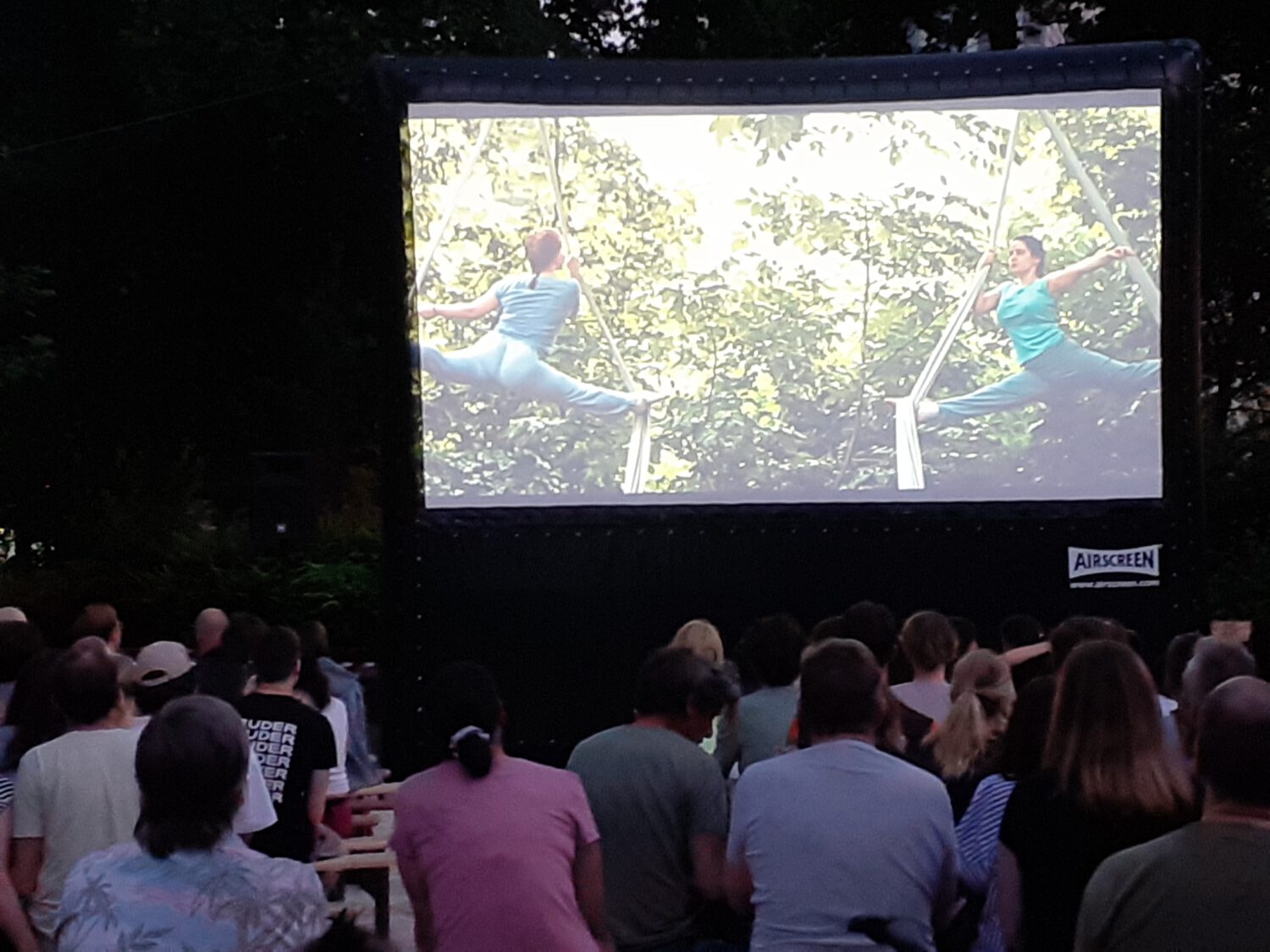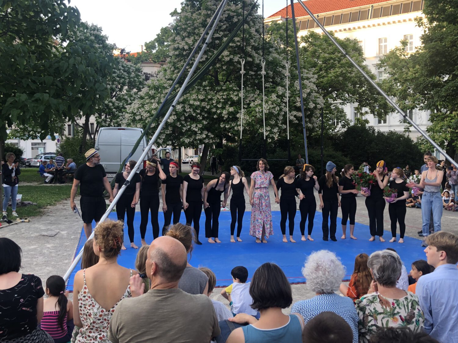 Die Circus Company des Circus Luftikus/JUVIVO.15 und der Zirkuswerkstatt performte live begleitet von der einzigartigen Cellistin Sophie Abraham als Vorprogramm zum diesjährigen VolXkino im Reithofferpark.